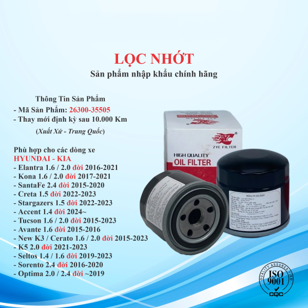 Lọc nhớt HYUNDAI Elantra, Kona, SantaFe, Creta, Stargazers, Accent 2024, Tucson, Avante – KIA New K3, Cerato, K5, Seltos, Sorento, Optima (Mã: 26300-35505)